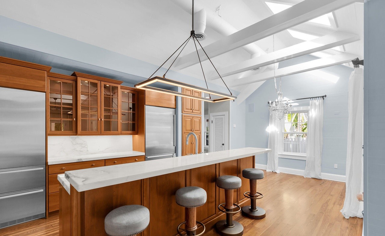 A sophisticated transitional kitchen featuring warm wood cabinetry with glass-front uppers, white quartz countertops, and a marble slab backsplash, anchored by a generous waterfall-edge island with brass-trimmed bar seating. The space is suffused with natural light from skylights and clerestory windows, complemented by a refined coffered ceiling and soft blue-gray walls that create a serene, elevated aesthetic.