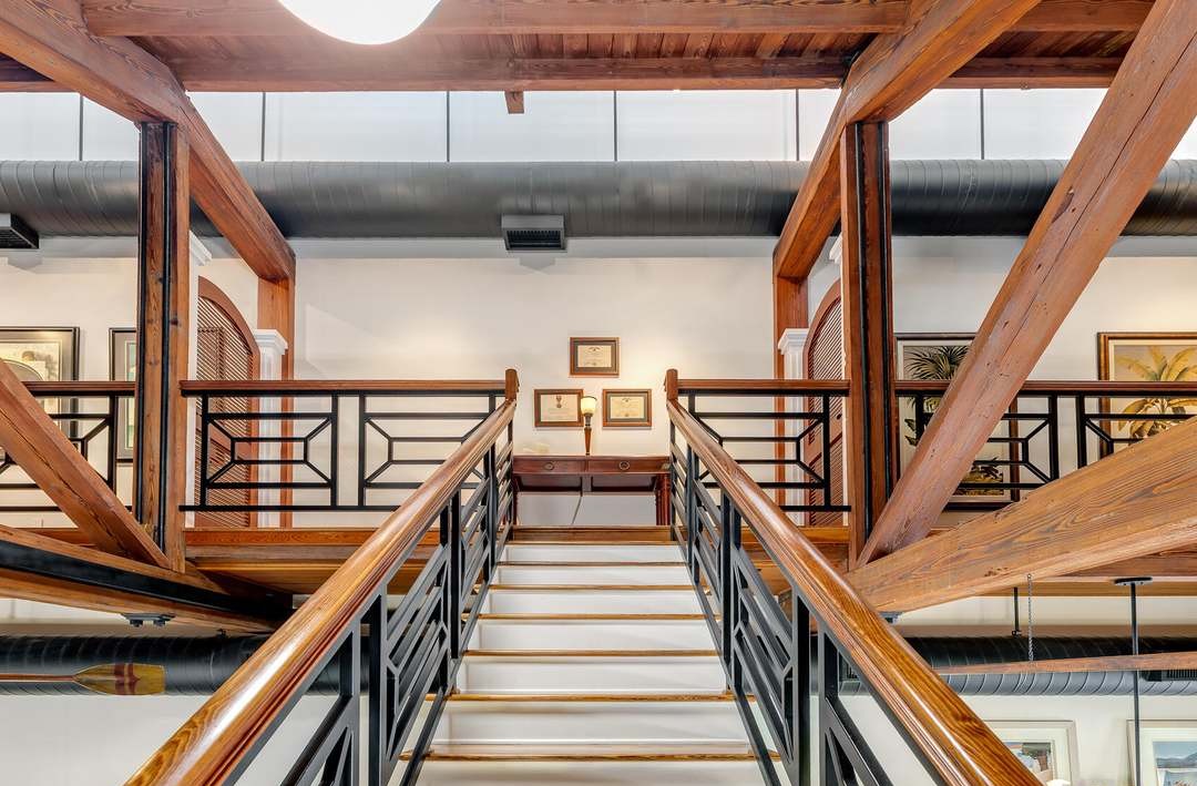A stunning multi-level staircase featuring substantial exposed timber beams, crisp white walls, and geometric black metal railings that create a sophisticated balance between rustic and contemporary design. The abundant natural light from the large skylight above and the polished hardwood flooring elevate this transitional space into an architectural focal point that exudes luxury and craftsmanship.
