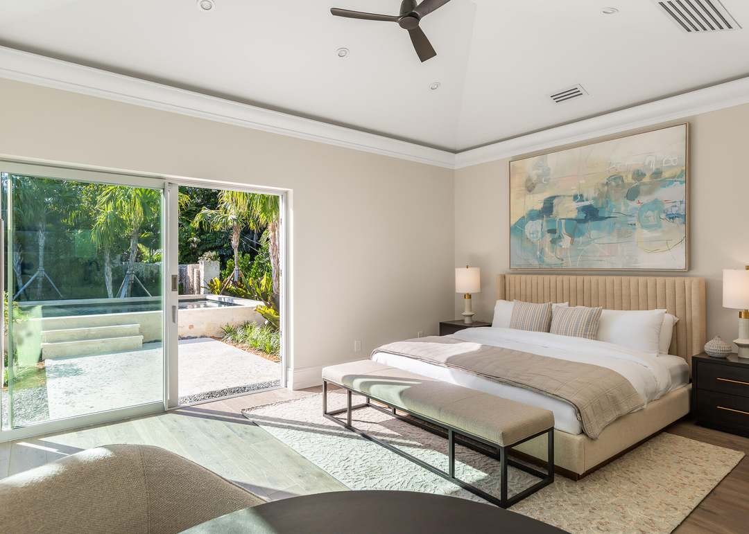 A serene luxury primary suite featuring a custom wood-slatted headboard and expansive floor-to-ceiling sliding glass doors that frame lush tropical gardens and a resort-style pool deck beyond. The transitional design blends warm, neutral tones with organic textures and high-end finishes, creating an airy retreat with abundant natural light and seamless indoor-outdoor living.