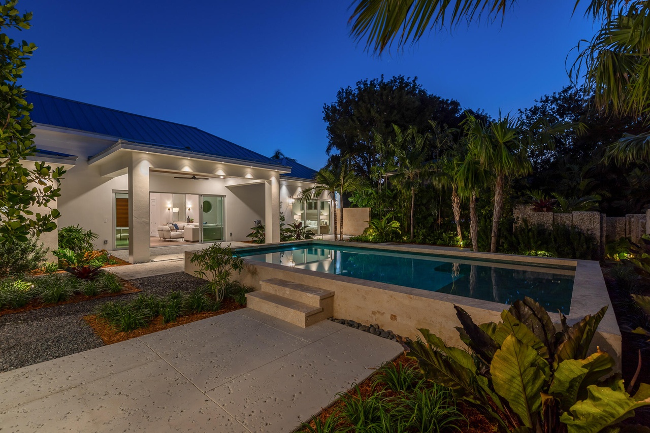 A stunning contemporary pool residence designed in desert modern style, featuring a raised geometric pool with warm-toned stone surround, white modernist architecture with floor-to-ceiling glazing, and sophisticated landscape integration with mature palms and tropical plantings. The design seamlessly blends indoor-outdoor living with crisp lines, warm neutrals, and carefully curated nighttime lighting that highlights both the architecture and lush tropical surroundings.