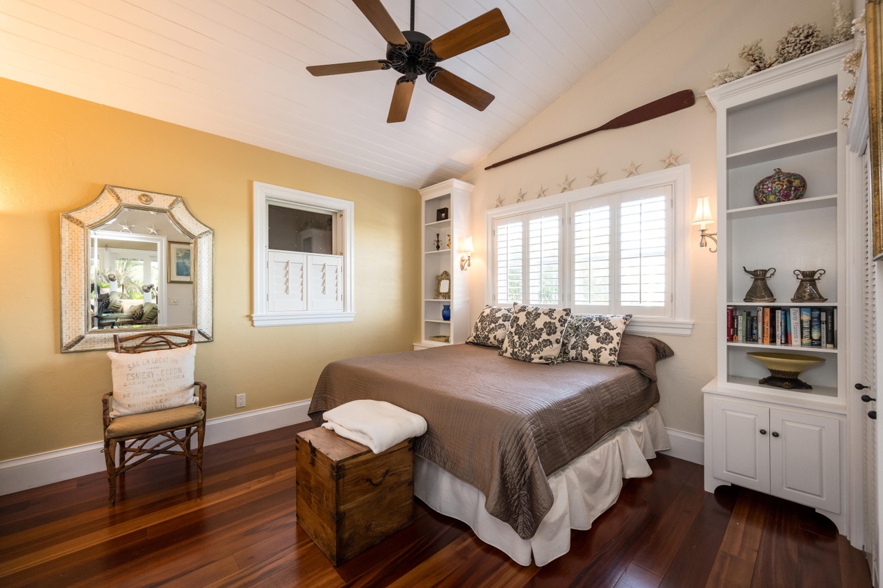 A sophisticated primary bedroom featuring warm cream and beige tones with white built-in cabinetry, rich hardwood flooring, and abundant natural light from plantation-shuttered windows framing a comfortable window seat. The space exemplifies refined transitional design with elegant millwork, classic proportions, and carefully curated furnishings that balance timeless elegance with comfortable luxury.