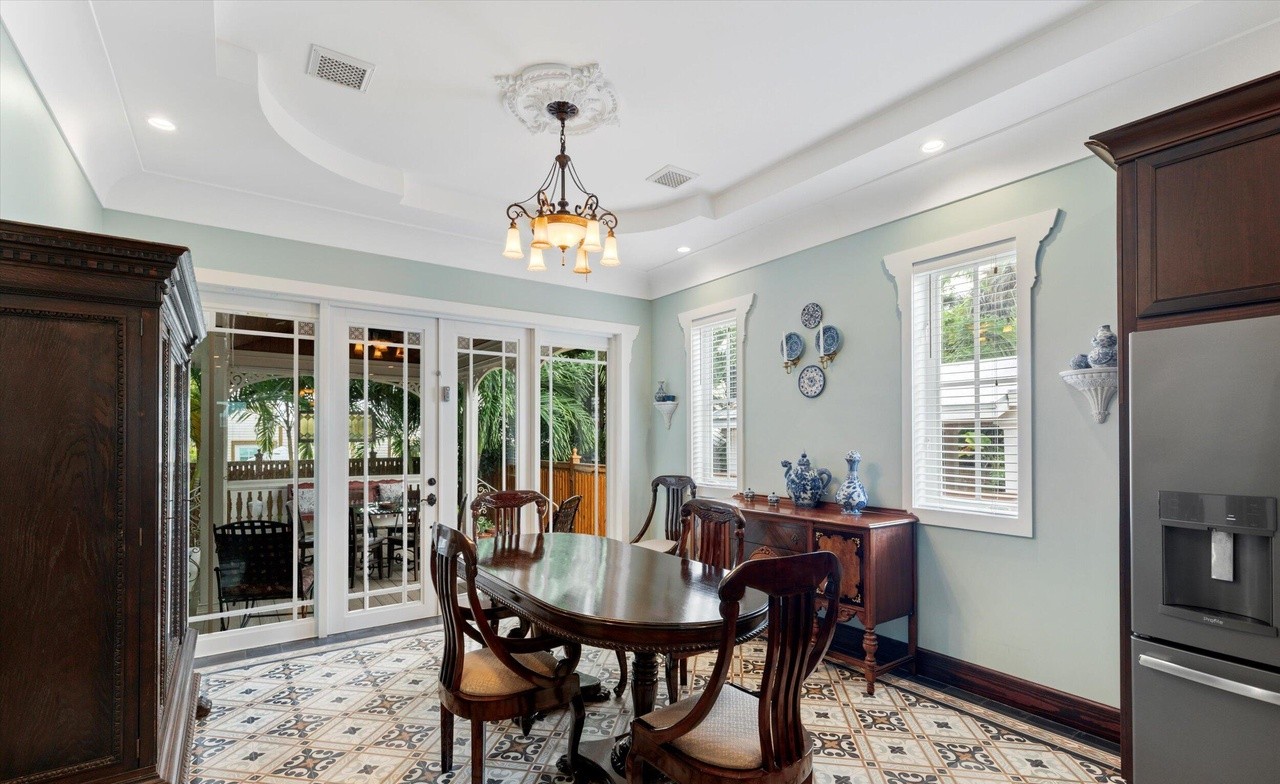 A sophisticated formal dining room featuring transitional Hamptons-inspired design with soft light blue walls, dark wood furniture, and classic architectural details including coffered ceilings and crown molding. The room exemplifies elegant coastal luxury with abundant natural light streaming through French doors and shuttered windows, complemented by a decorative brass chandelier and carefully curated blue-and-white ceramic accents.
