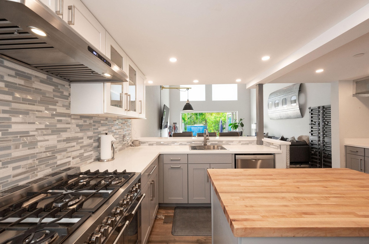 A stunning transitional kitchen featuring a waterfall-edge quartz island with warm butcher block countertop, paired with gray shaker cabinetry and a sophisticated linear ceramic tile backsplash in neutral tones. Floor-to-ceiling windows flood the open-concept space with natural light, while brass hardware and a statement black pendant provide elegant accents against clean modern lines and professional-grade stainless appliances.