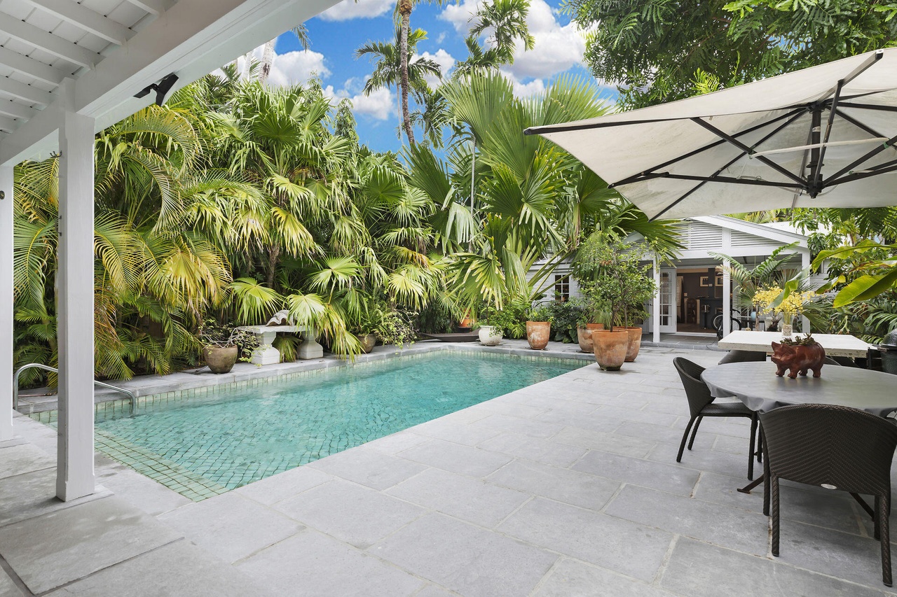An ultra-luxury tropical pool area featuring a pristine turquoise pool surrounded by lush palm trees and verdant landscaping, anchored by a sophisticated white modern structure with a black-framed pergola and high-end outdoor furnishings. The serene composition balances clean architectural lines with abundant natural greenery, creating an editorial-quality resort-like sanctuary.