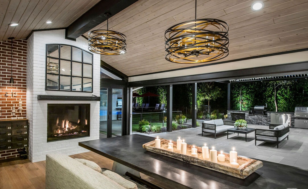FireplaceFloor To Ceiling WindowsStatement LightingCovered PatioOutdoor SeatingLiving WallOutdoor FurnitureBuilt In GrillPendant LightingExposed Beam