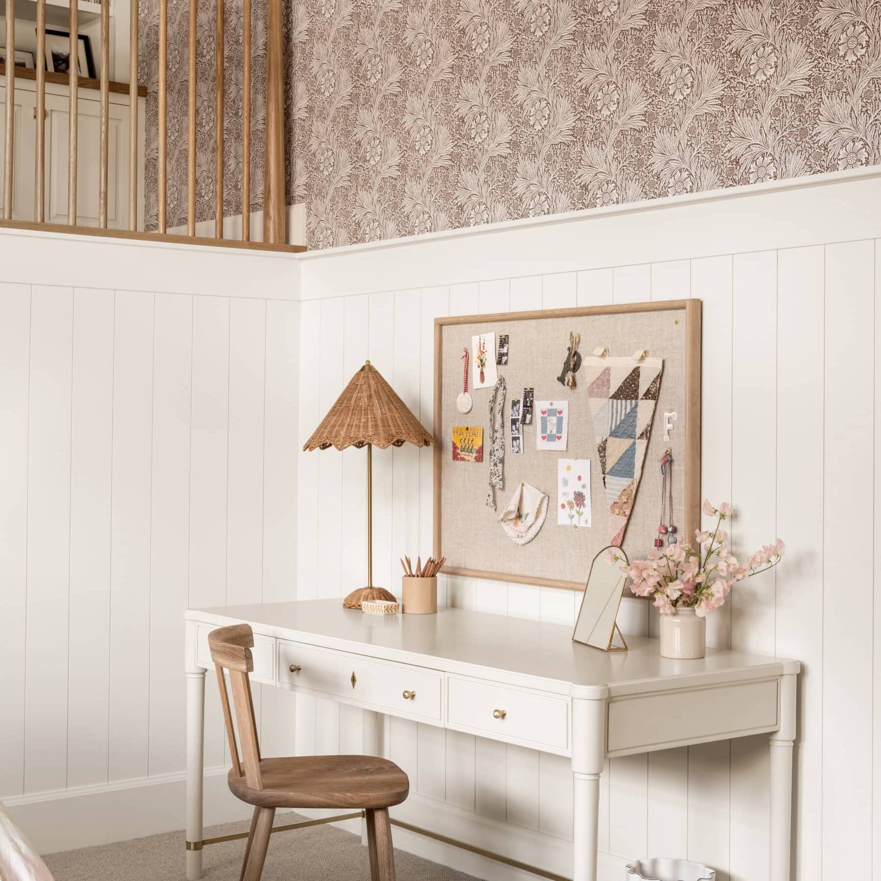 A refined, light-filled home office featuring crisp white shiplap wainscoting paired with elegant patterned wallpaper above, creating a transitional coastal aesthetic. Anchored by a classic white painted desk with brass hardware and accented with natural wood furnishings, rattan details, and soft pink floral arrangements that evoke understated luxury and timeless elegance.