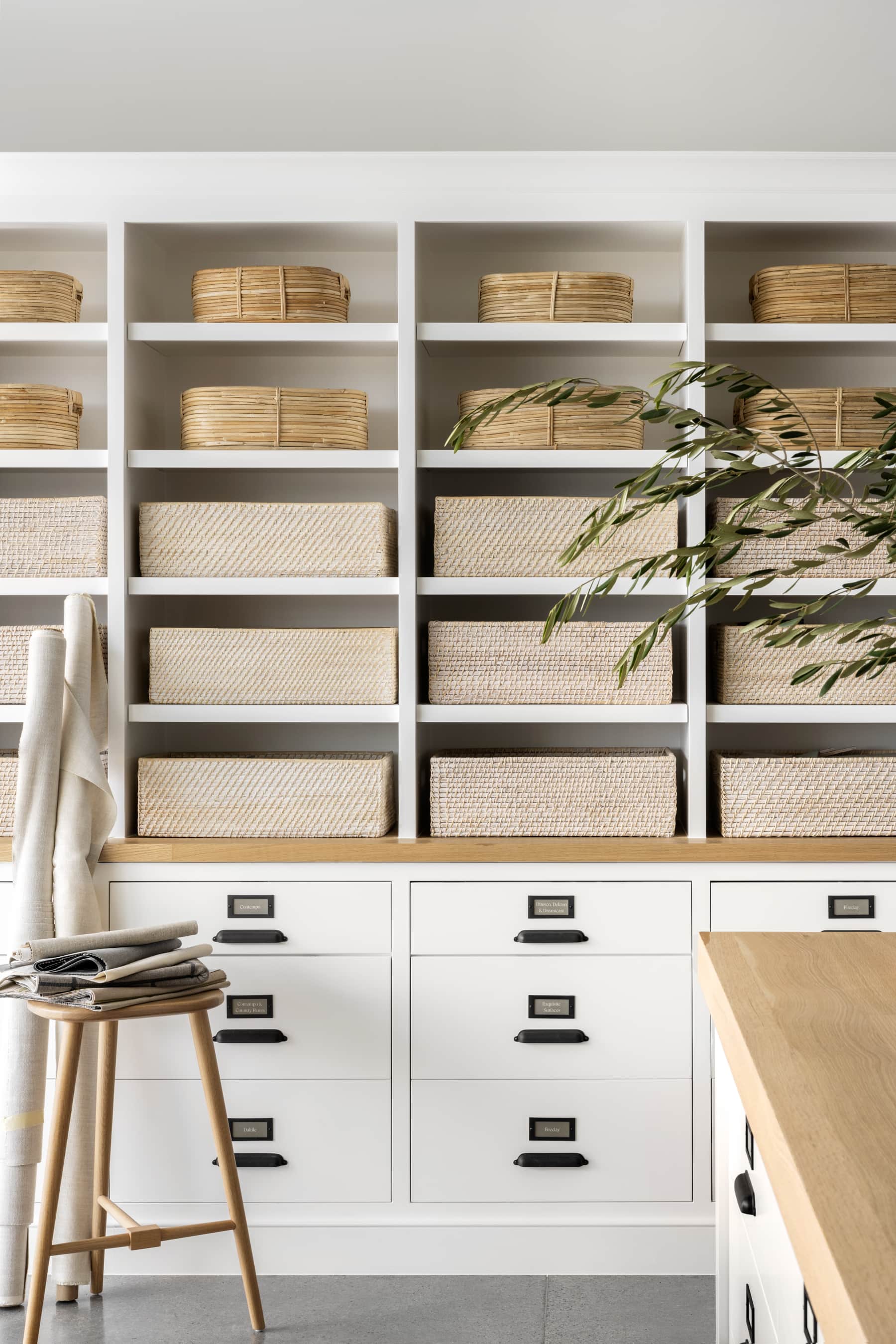 A serene Scandinavian-inspired home office featuring floor-to-ceiling custom white cabinetry with open shelving and natural rattan storage baskets, paired with a butcher block floating desk and warm wood stool. The calm, organized aesthetic is enhanced by neutral tones, minimal decoration, and a fresh greenery accent that creates an inviting, productive workspace.