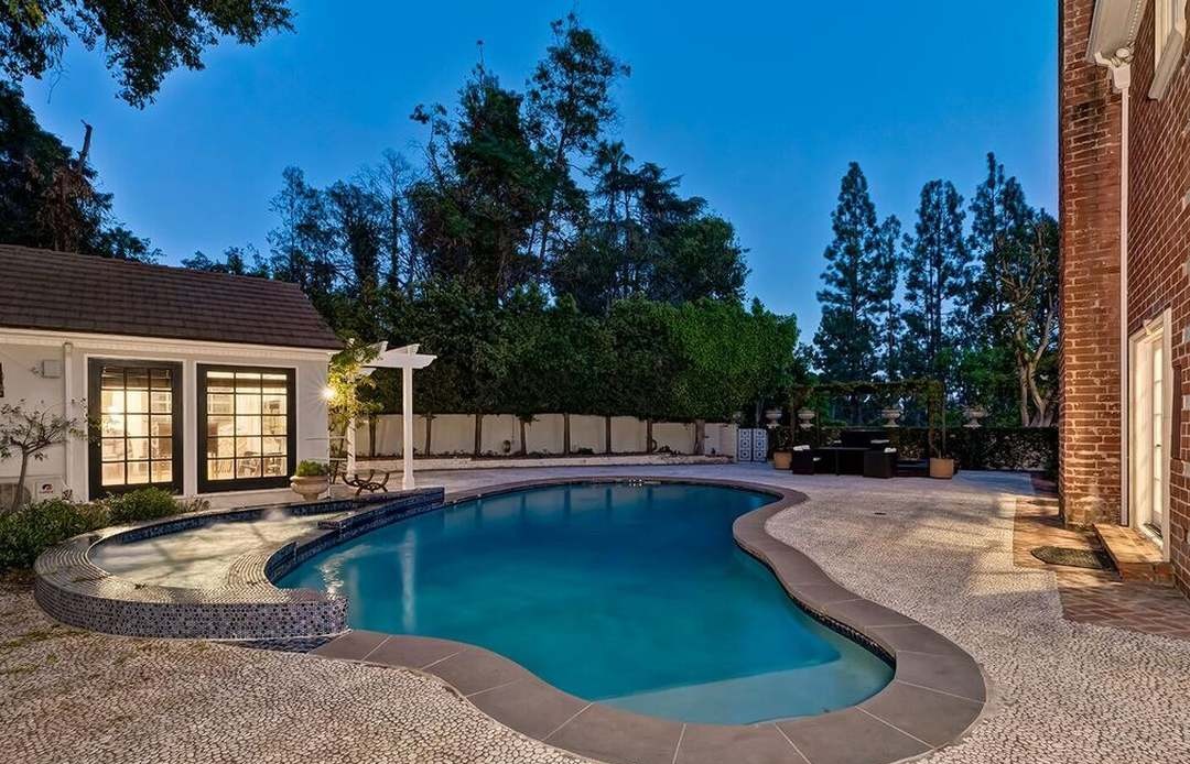 An exceptionally well-designed resort-style pool area featuring a gracefully curved free-form pool with pristine turquoise water, surrounded by warm-toned stone pavers and punctuated by a charming poolside structure with modern lines. The space achieves a perfect balance of luxurious sophistication and relaxed elegance through carefully curated landscaping, ambient lighting, and clean contemporary architecture that maximizes the Southern California indoor-outdoor lifestyle.