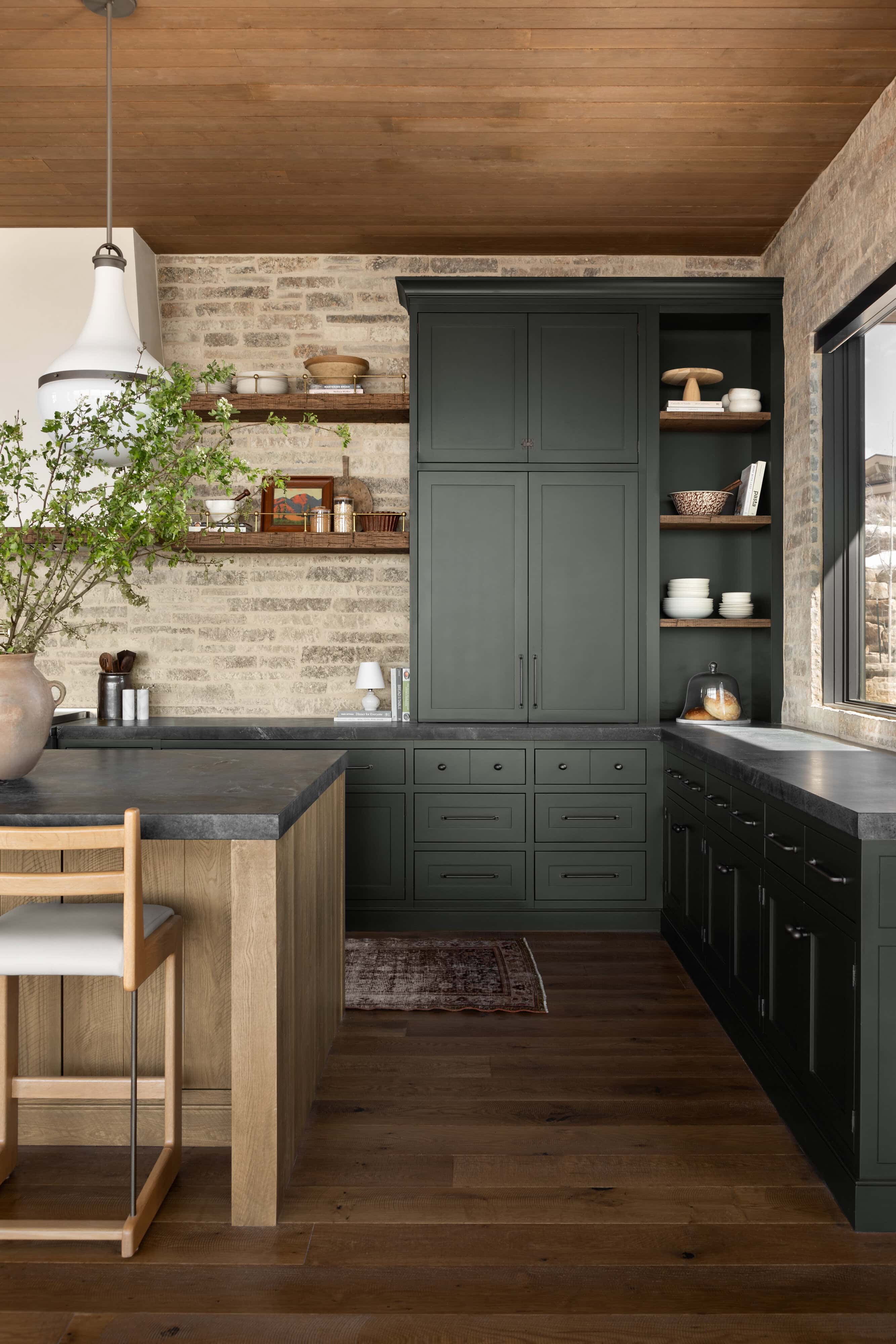 Countertop: Slate Or Dark StoneCabinets: Flat Panel With Frame DetailCabinet Color: Forest Green And Natural Wood Two ToneFlooring: HardwoodBacksplash: BrickWall Treatment: BrickCeiling: Wood Plank