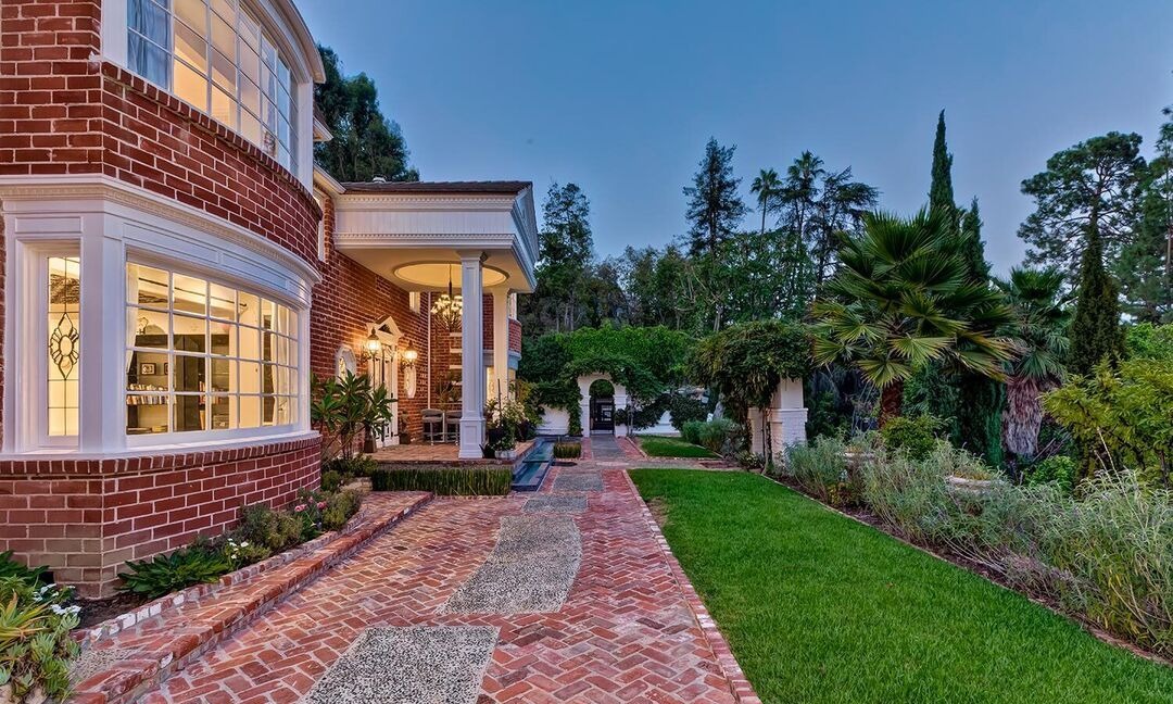 This elegant transitional patio showcases a brick home exterior with refined architectural details including a columned portico and crown molding, connected by a handsome herringbone brick walkway accented with gravel inlay. The manicured grounds feature mature palms and cypress trees, creating a sophisticated Mediterranean-meets-Hamptons aesthetic of classic East Coast luxury.