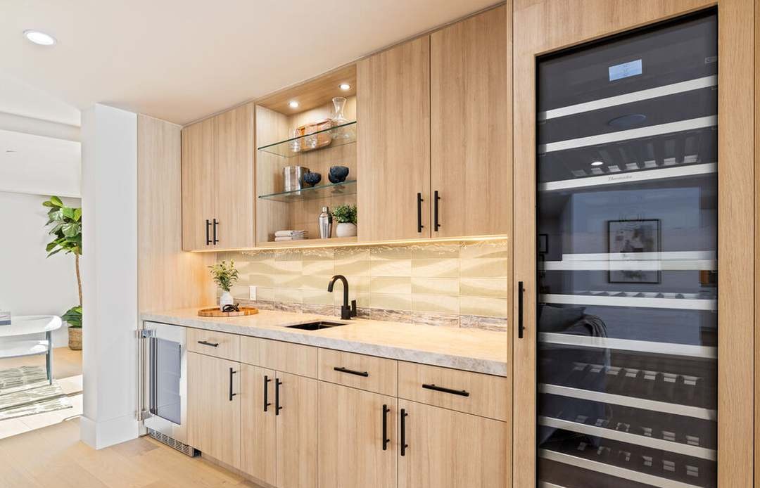A sophisticated galley kitchen featuring warm light wood cabinetry paired with clean-lined quartz countertops and soft ceramic tile backsplash, unified by minimalist black hardware and integrated warm gold accent lighting. The integrated wine fridge and open shelving demonstrate considered luxury, while the serene neutral palette and carefully curated styling create an understated, contemporary elegance.
