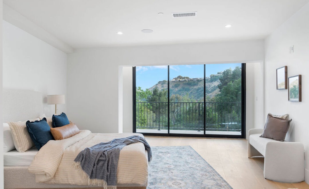 A serene primary bedroom suite featuring floor-to-ceiling black-framed glass doors opening to sweeping mountain views, with a warm neutral palette of creams and tans accented by navy and bronze elements. The space combines organic modern warmth with transitional sophistication, highlighted by abundant natural light, quality linens, and carefully curated furnishings that emphasize both comfort and elegance.