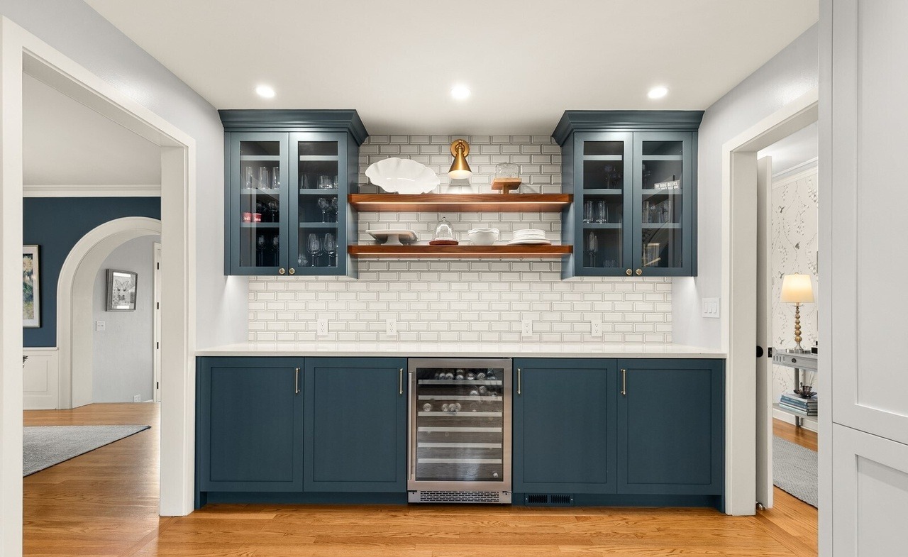 A sophisticated home bar features rich navy cabinetry with glass-front upper storage flanking warm wood floating shelves, all set against crisp white subway tile backsplash. The design balances traditional millwork details with modern minimalist hardware and a built-in wine cooler, creating an elegant entertaining space with refined New England sensibility.