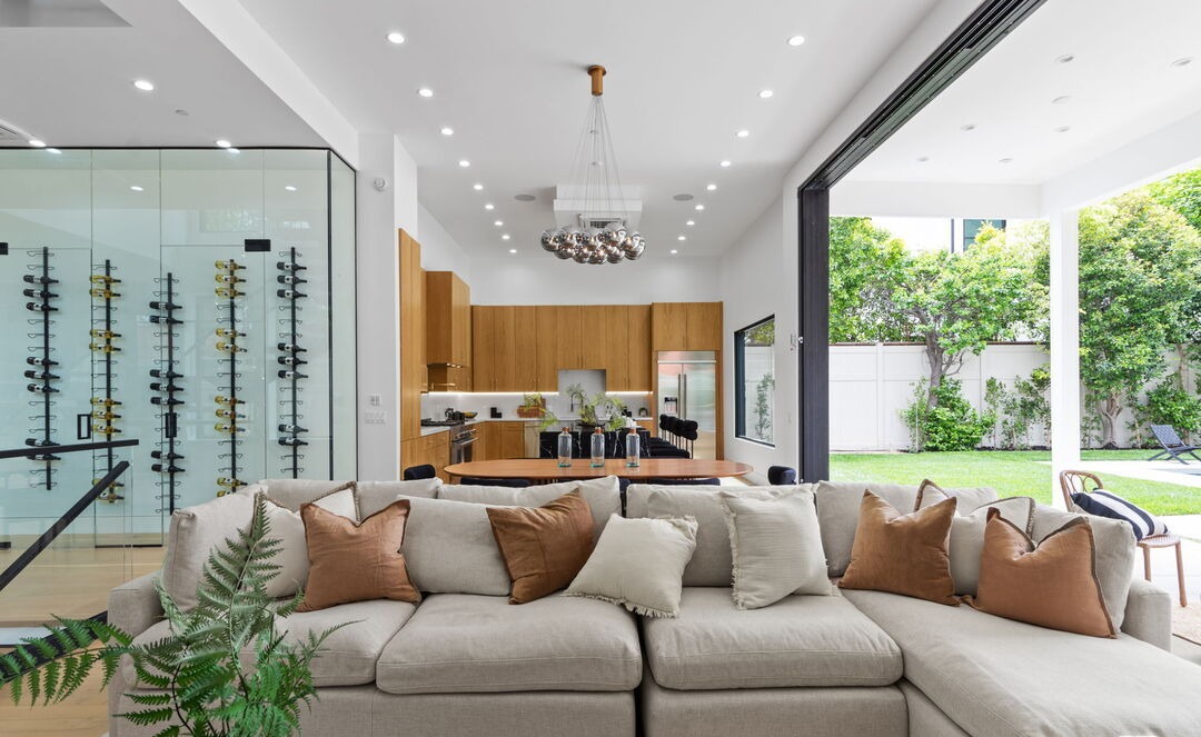 A stunning open-concept living space seamlessly integrating indoor and outdoor living with floor-to-ceiling glass walls overlooking manicured landscaping. The room features a sculptural sectional sofa in warm neutrals, a custom wine display with brass hardware, natural wood cabinetry, and a striking sculptural pendant chandelier, creating a sophisticated yet inviting sanctuary that balances modern minimalism with organic warmth.