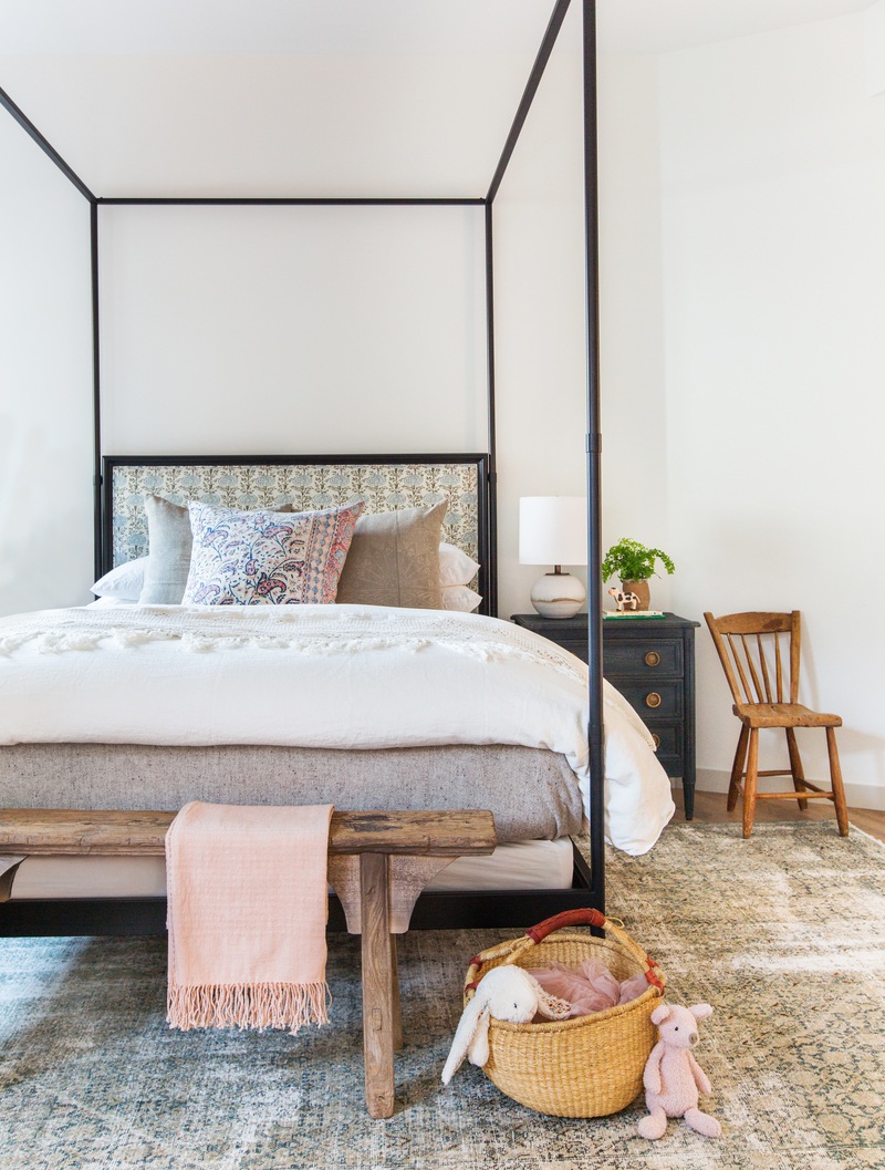 A sophisticated primary bedroom featuring a striking black canopy bed with patterned upholstered headboard, layered with artfully coordinated textiles in blues, corals, and neutrals. The space balances modern architectural elements with warm, natural materials including hardwood flooring, wooden furnishings, and organic textural accents like woven baskets, creating a serene yet collected aesthetic.