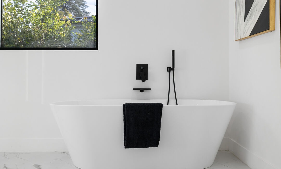 A serene, minimalist primary bathroom featuring a sculptural freestanding soaking tub centered in a gallery-like white space, anchored by polished marble flooring and floor-to-ceiling windows framing verdant natural light. Black matte fixtures and carefully curated art elevate this spa-like retreat through restraint and refined material choices.