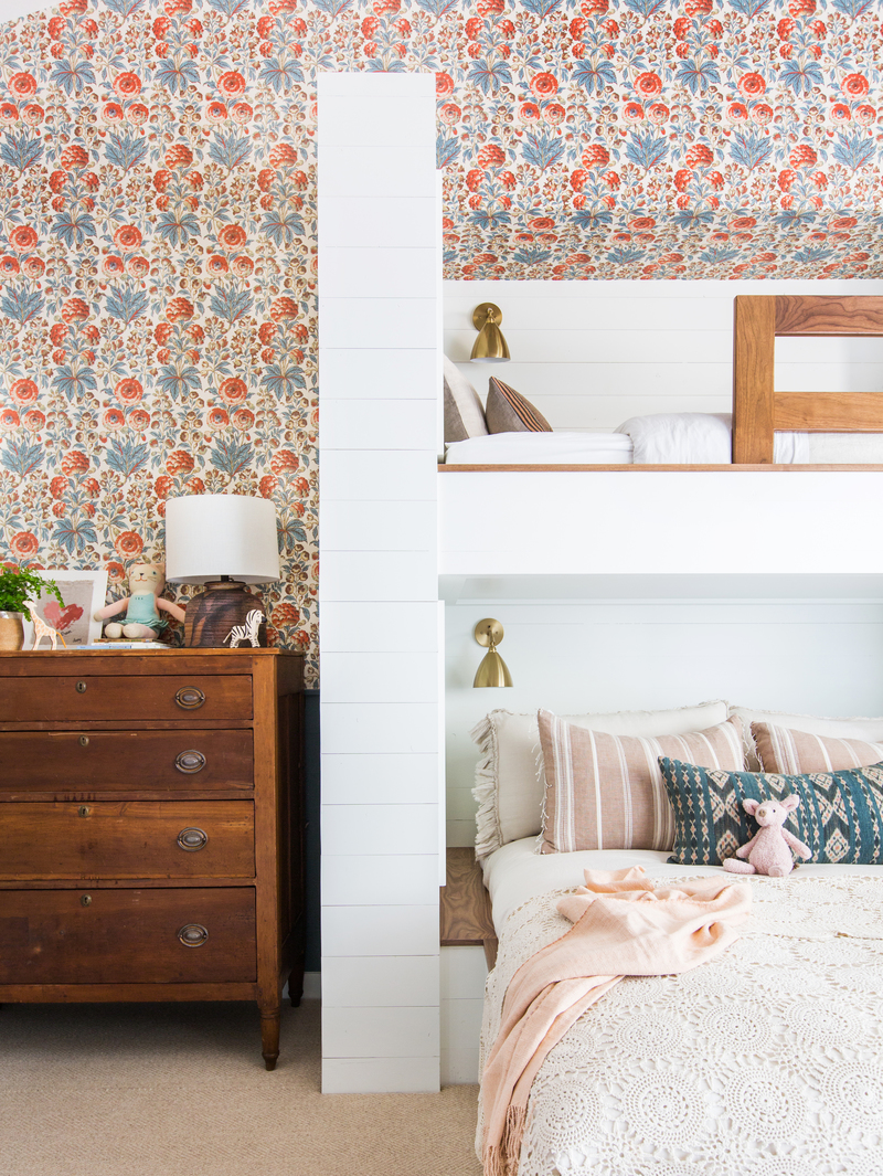 A sophisticated guest bedroom showcasing new traditional design with a striking coral and blue floral wallpaper statement wall, crisp white built-in shelving with brass hardware, and warm walnut wood furnishings. The layered textiles, curated bedding with geometric patterns, and soft lighting create an inviting, romantically elegant retreat that balances classic architectural details with contemporary comfort.