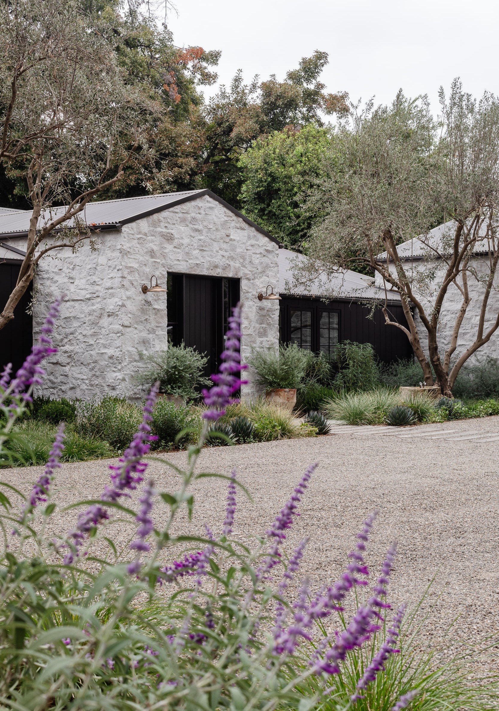 A sophisticated desert modern outdoor living space featuring whitewashed stone structures with black trim, surrounded by drought-tolerant native plantings including olive trees and purple flowering perennials. The covered patio with metal overhang creates a serene, minimalist retreat that seamlessly blends architectural refinement with natural landscape design.