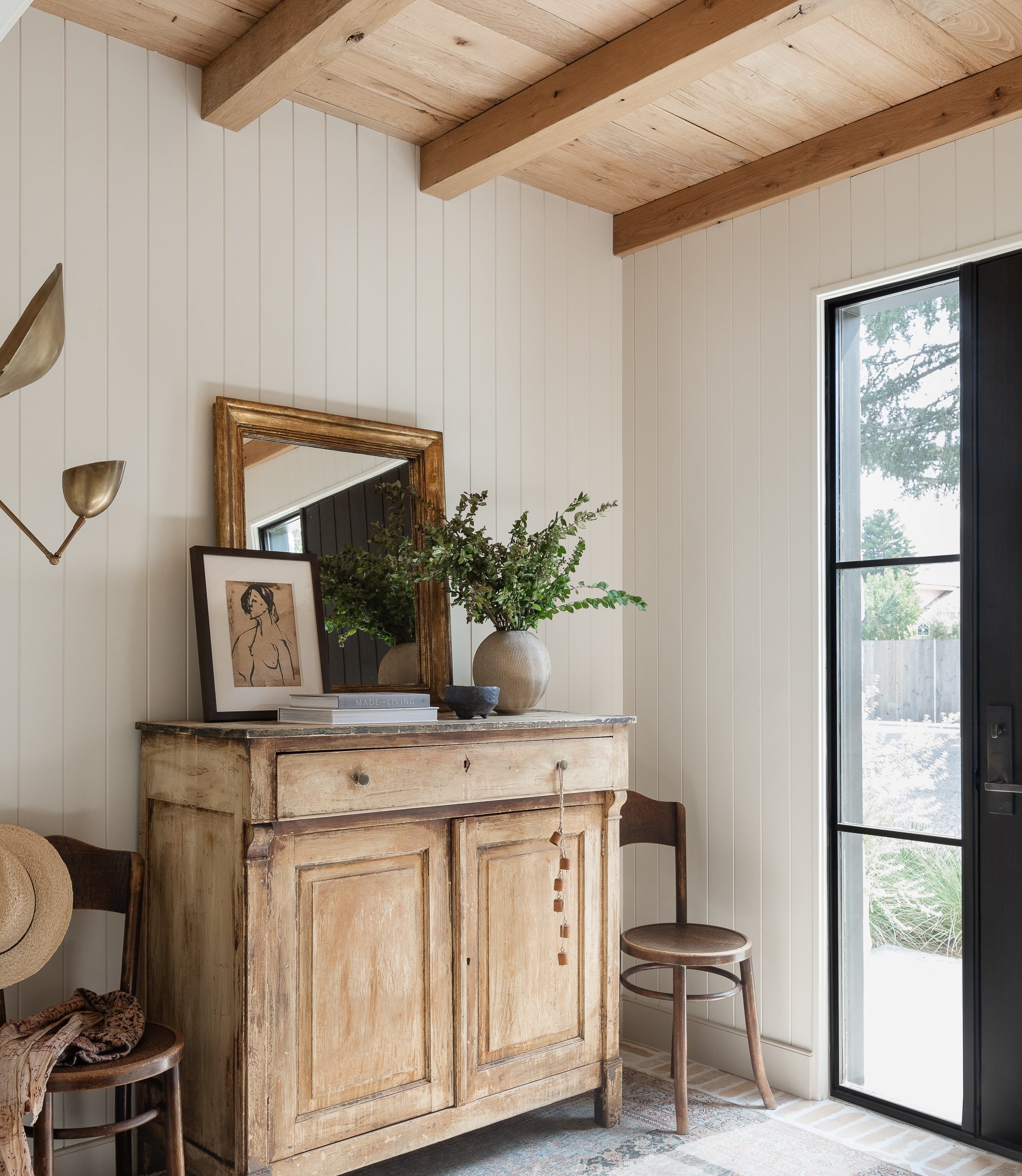 A serene entryway featuring warm, natural materials—cream shiplap walls, exposed wooden beams, and a beautifully aged wood cabinet—creating a sophisticated yet relaxed atmosphere. Large gridded windows flood the space with natural light, while carefully curated vintage furnishings and botanical elements complete the organic, modern aesthetic.