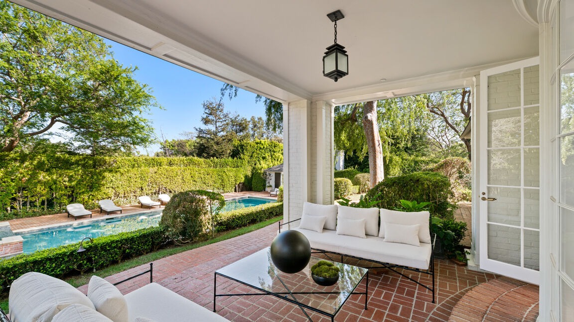 An elegantly designed covered patio overlooking a resort-style backyard with resort pool and manicured hedges, featuring sophisticated transitional style with white upholstered seating, black metal-frame furniture, and brick herringbone flooring. The space seamlessly blends indoor comfort with outdoor living through extensive glass doors and abundant natural light, epitomizing high-end Southern California design.
