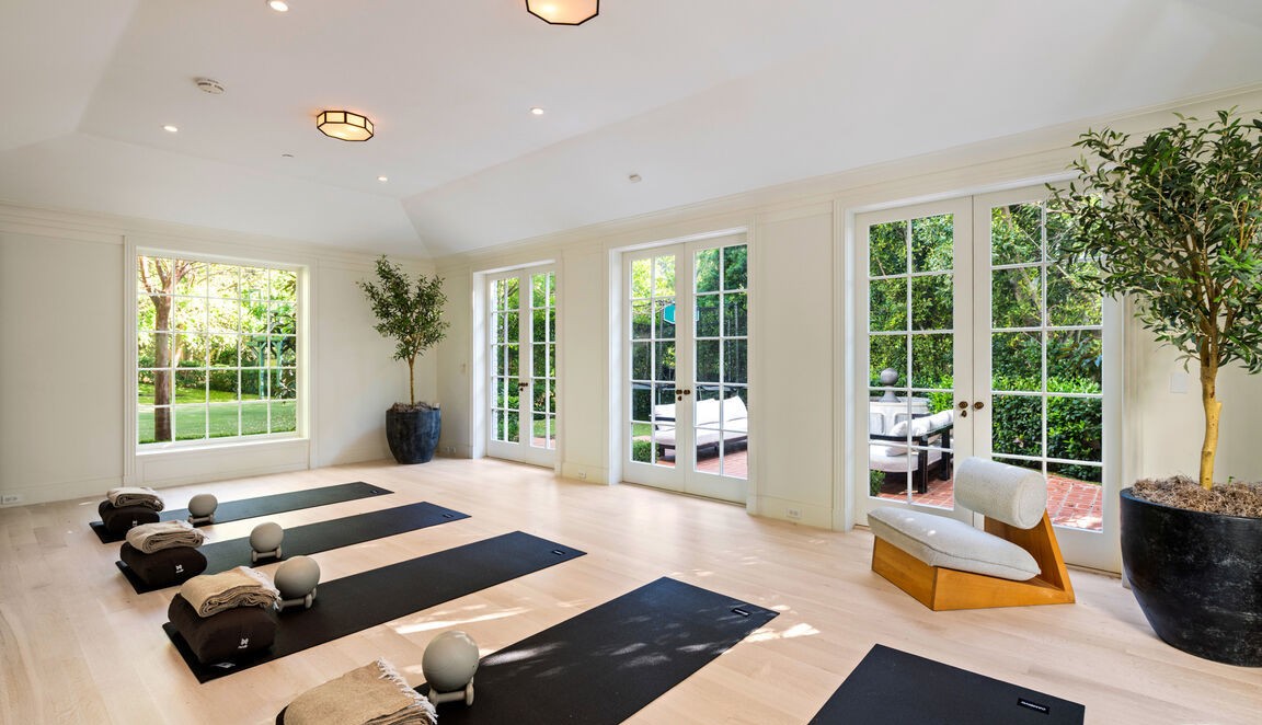 A stunning private home yoga and fitness studio bathed in natural light through floor-to-ceiling windows, featuring minimalist navy and black yoga mats arranged on a warm light wood floor, complemented by sculptural seating and living plants that bring organic warmth to the serene, airy space. The design exemplifies contemporary luxury with refined restraint, prioritizing calm functionality and connection to nature through abundant glazing and biophilic elements.
