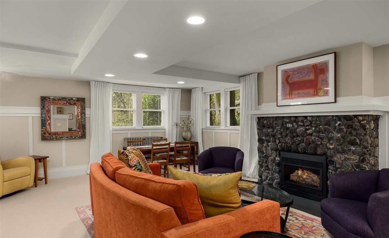 This sophisticated transitional living room seamlessly blends traditional architectural details—including coffered ceiling, wainscoting, and crown molding—with contemporary furnishings and a warm, layered color palette of cream, orange, navy, and gold. The dramatic dark-stone fireplace serves as the room's focal point, while abundant natural light from multi-pane windows and curated art create an inviting yet refined atmosphere.