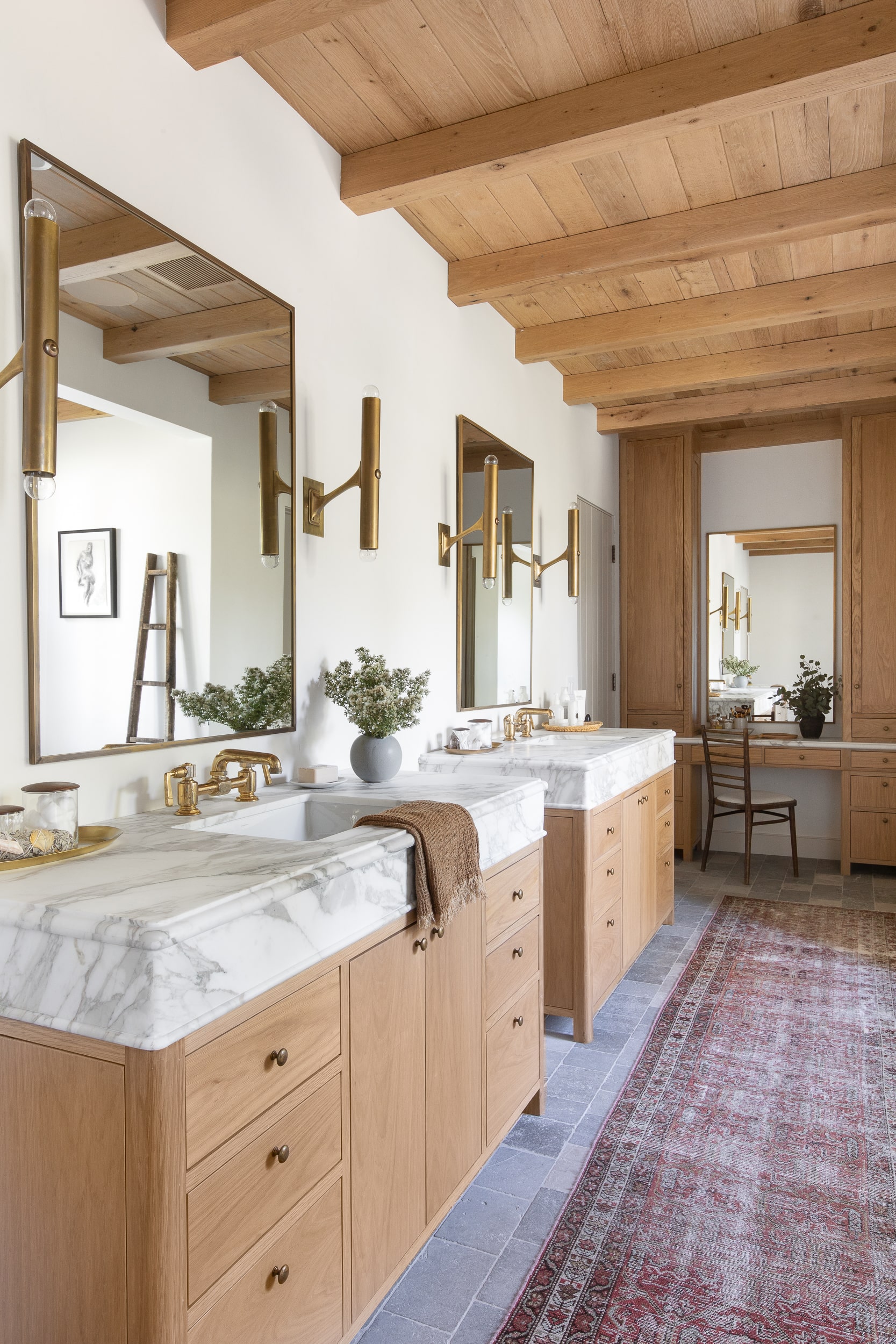A stunning dual-vanity primary bathroom featuring exposed wooden beams and soaring ceilings, with marble countertops and natural light wood cabinetry accented by warm brass hardware. The space balances modern elegance with organic warmth through carefully curated materials and a serene, gallery-like presentation elevated by statement brass sconces and oversized mirrors.