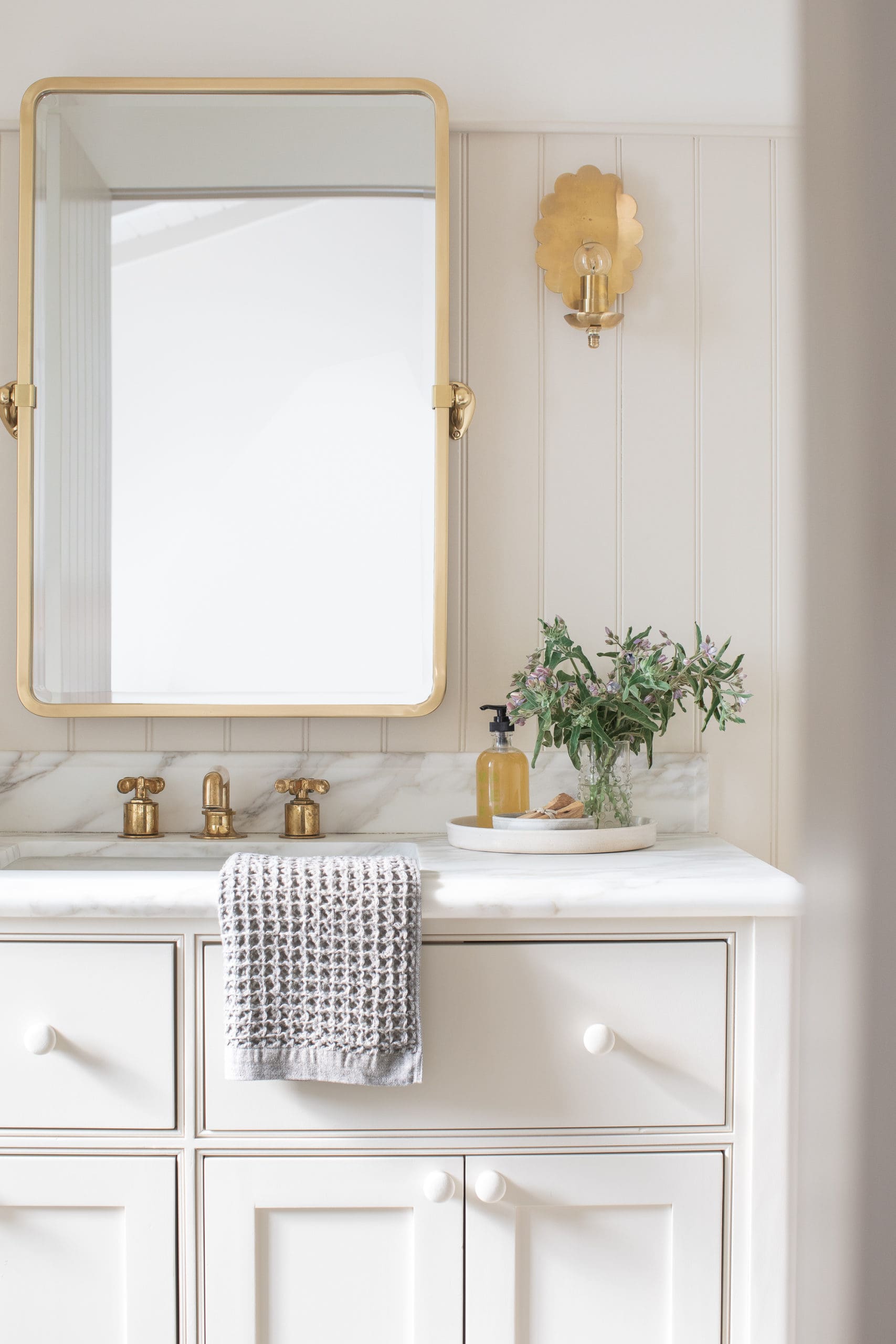 A serene primary bathroom featuring a luxurious floating marble vanity with brass hardware, complemented by crisp white shaker cabinetry and elegant board-and-batten wall treatment. The space achieves sophisticated simplicity through carefully curated materials and accessories, including a large brass-framed pivot mirror, sculptural brass wall sconce, and fresh botanical arrangement that enhance the refined, spa-like atmosphere.