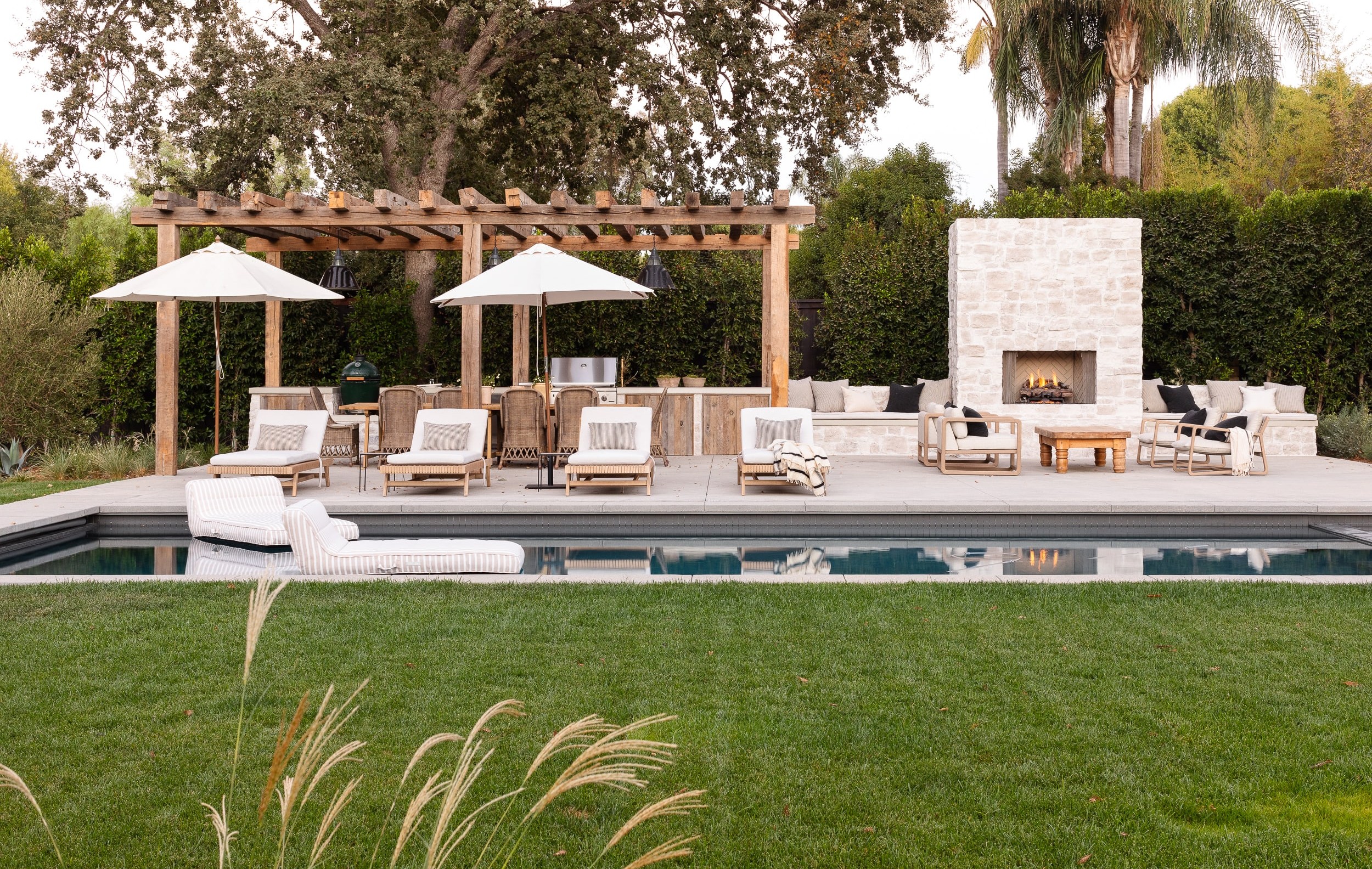 An expansive resort-style pool area featuring a sculptural stone fireplace, sophisticated lounge seating with cream cushions, and a wooden pergola structure, unified by warm neutrals and organic materials in a seamlessly integrated outdoor living environment. The composition balances luxury comfort with natural landscaping and modern architectural elements, epitomizing high-end contemporary outdoor design.