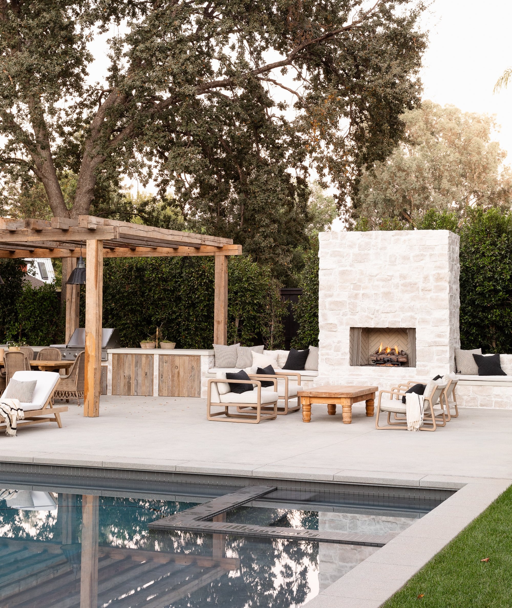 This stunning desert modern patio seamlessly blends indoor-outdoor living with a minimalist aesthetic anchored by a dramatic oversized stone fireplace and warm natural materials. The thoughtfully curated seating areas, mature landscape, and pergola create an editorial-quality outdoor sanctuary that prioritizes serene elegance and sophisticated material restraint.