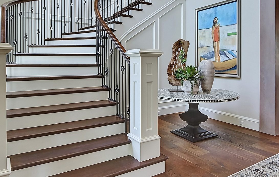 An elegantly designed curved staircase featuring ornamental wrought-iron railings and dark wood handrails, anchoring a sophisticated entry hall with crisp white painted walls and premium hardwood flooring. The space exemplifies transitional luxury with refined classical details—crown molding, wainscoting, and a pedestal display table—balanced against clean modern finishes and understated contemporary art.