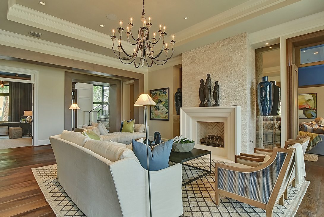 A sophisticated transitional living room anchored by a cream-toned fireplace with stone surround and elegant brass chandelier, featuring a coffered ceiling and custom millwork that balances traditional architectural details with contemporary furniture. The warm neutral palette, layered lighting, hardwood flooring, and carefully curated furnishings create a serene yet refined space perfect for both relaxation and entertaining.