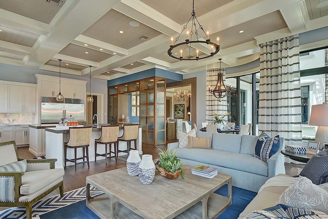 A stunning open-concept living and kitchen space exemplifying contemporary coastal transitional design with crisp white cabinetry, marble countertops, and light blue accent walls. The sophisticated coffered ceiling, abundant natural light, layered brass statement lighting, and carefully curated furnishings in blue and cream create an airy yet deeply luxurious atmosphere.