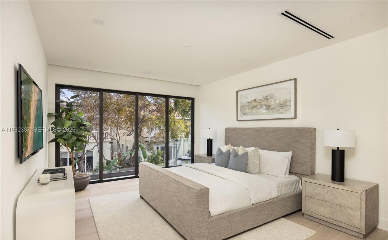 A serene primary bedroom featuring a minimalist aesthetic with soft neutral tones, natural light from expansive floor-to-ceiling windows overlooking mature landscaping, and a carefully curated blend of organic materials including light-wood furnishings and textured linens. The sophisticated design balances warmth and restraint, with subtle black accent fixtures and clean-lined contemporary elements creating an inviting luxury retreat.
