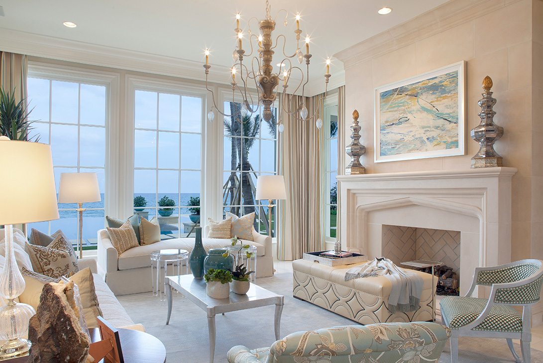 An exceptionally refined formal living room featuring floor-to-ceiling oceanfront windows, a classical brass candelabra chandelier, and elegant transitional furnishings in cream and taupe tones with gold and blue accents. The room showcases museum-quality craftsmanship through custom millwork, marble flooring, and perfectly appointed traditional-modern furnishings that create a serene yet luxurious coastal sanctuary.
