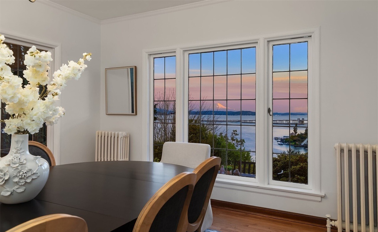 An elegant waterfront dining room featuring expansive floor-to-ceiling windows framing a stunning sunset and water views, anchored by a modern round dining table with wood-trimmed chairs and pristine white millwork. The refined palette of whites, grays, and soft blues combined with hardwood flooring and classical architectural details creates a serene yet sophisticated New England coastal aesthetic.