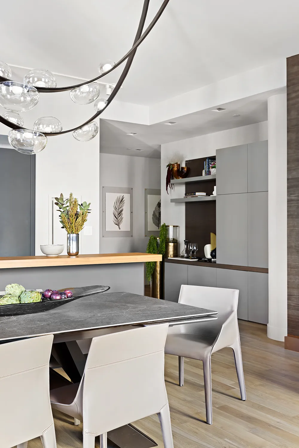 A sophisticated kitchen blending organic modern and transitional design, featuring a striking dark marble island with natural wood accents, crisp white and dark gray cabinetry, and an elegant sculptural black chandelier. The open-concept layout with integrated shelving and clean-lined furnishings creates a serene yet luxurious cooking environment with refined material pairings and professional-grade spatial planning.