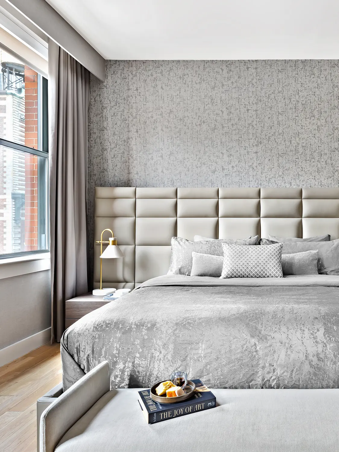 A sophisticated primary bedroom with a custom upholstered grid-pattern headboard and carefully curated neutral palette, anchored by abundant natural light from floor-to-ceiling windows. The space combines transitional architectural details with organic modern furnishings, creating a serene, high-end sanctuary accented with warm brass fixtures and layered textural elements.
