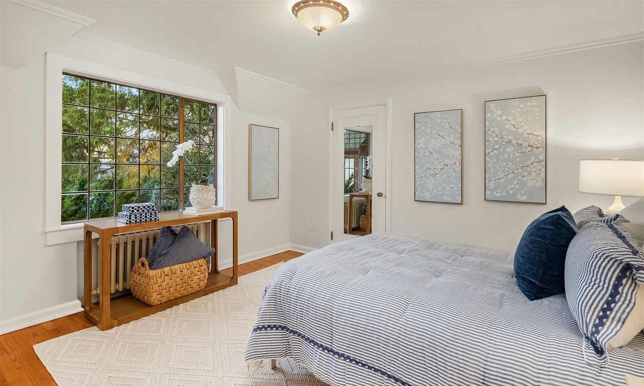 A serene primary bedroom featuring sophisticated transitional design with abundant natural light from a large gridded window overlooking greenery. The space combines traditional architectural details like crown molding with clean-lined contemporary furnishings, a neutral palette of whites and creams anchored by navy accents and warm wood tones.