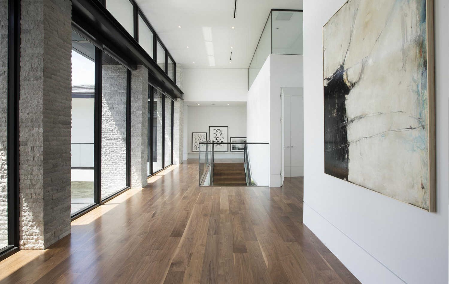 A stunning modern gallery hallway with soaring ceilings, abundant natural light from floor-to-ceiling black-framed windows, and warm hardwood flooring that anchors the minimalist white palette. Exposed brick columns, a dramatic abstract artwork, and a sleek glass railing create architectural interest while maintaining serene elegance and open spatial flow.