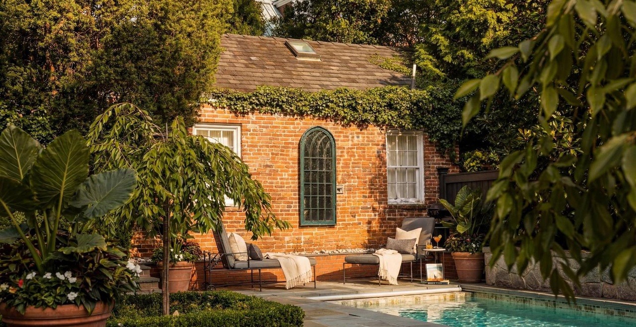 A stunning resort-style pool courtyard featuring a warm-toned brick cottage framed by mature ivy-covered walls and lush greenery, creating an intimate European-inspired retreat. The composition balances the vibrant turquoise pool with refined furnishings, soft textiles, and carefully curated plantings, delivering sophisticated outdoor luxury with serene, romantic ambiance.