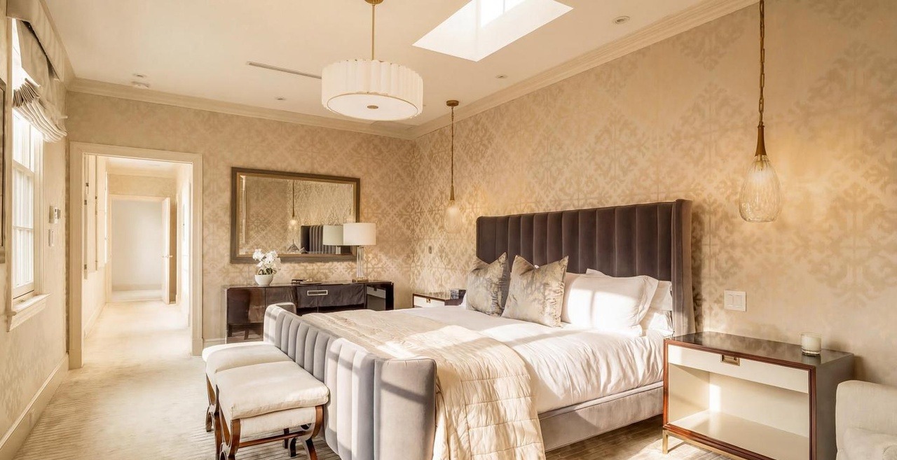A stunning primary bedroom suite featuring warm, sophisticated design with patterned wallpaper, a luxurious upholstered headboard, and abundant natural light from an expansive skylight. The space seamlessly blends traditional architectural details like crown molding with modern furnishings and brass accents, creating an elegant and serene retreat.