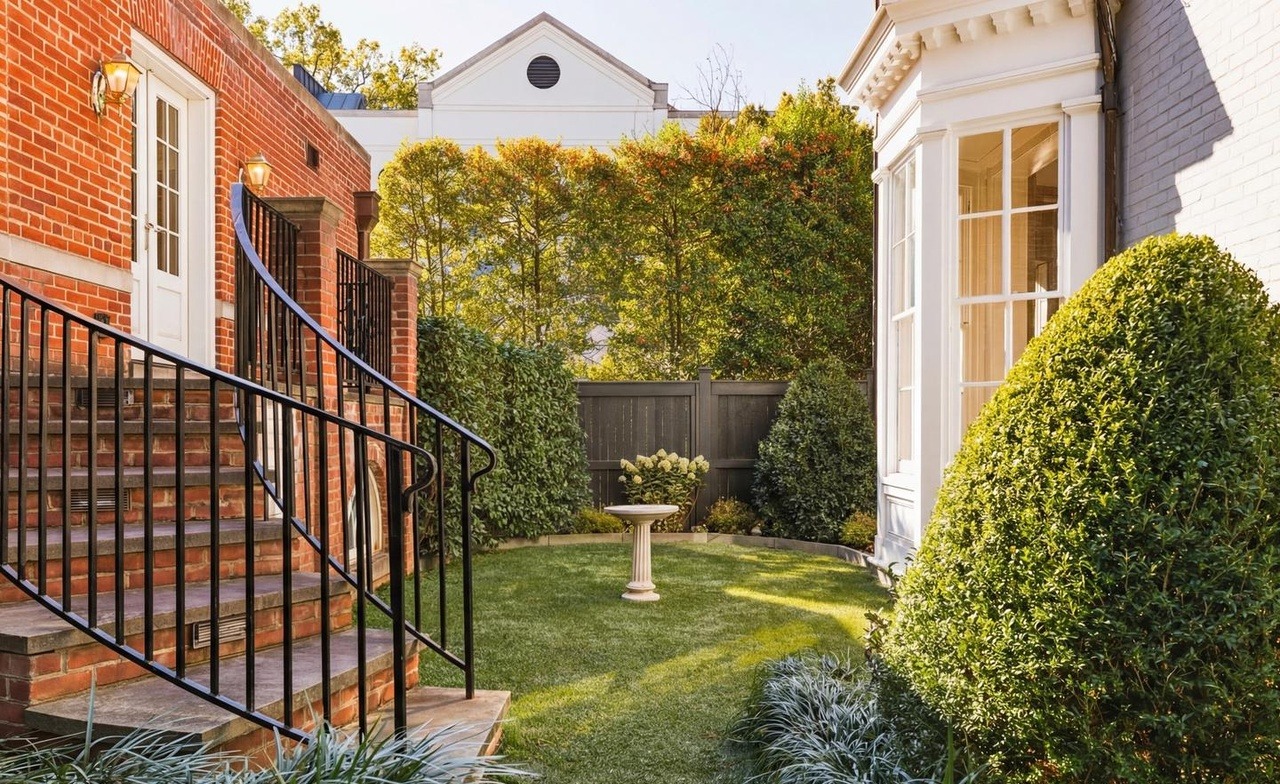 An elegantly designed courtyard garden featuring classical architecture with brick facades, manicured topiary hedges, and ivy-covered fencing that creates a serene, formal outdoor living space. The composition balances traditional New England aesthetic with refined details including a pedestal urn centerpiece, black metal railings, and sophisticated plantings that evoke timeless hamptons elegance.