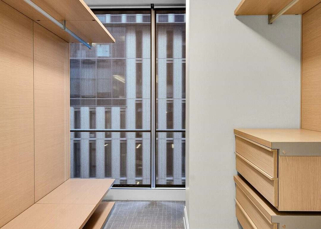 A sophisticated minimalist walk-in closet with warm light wood cabinetry and shelving, featuring clean-lined flat-panel doors and black hardware accents. Abundant natural light from floor-to-ceiling windows and a serene, uncluttered design emphasize quality craftsmanship and functional luxury.
