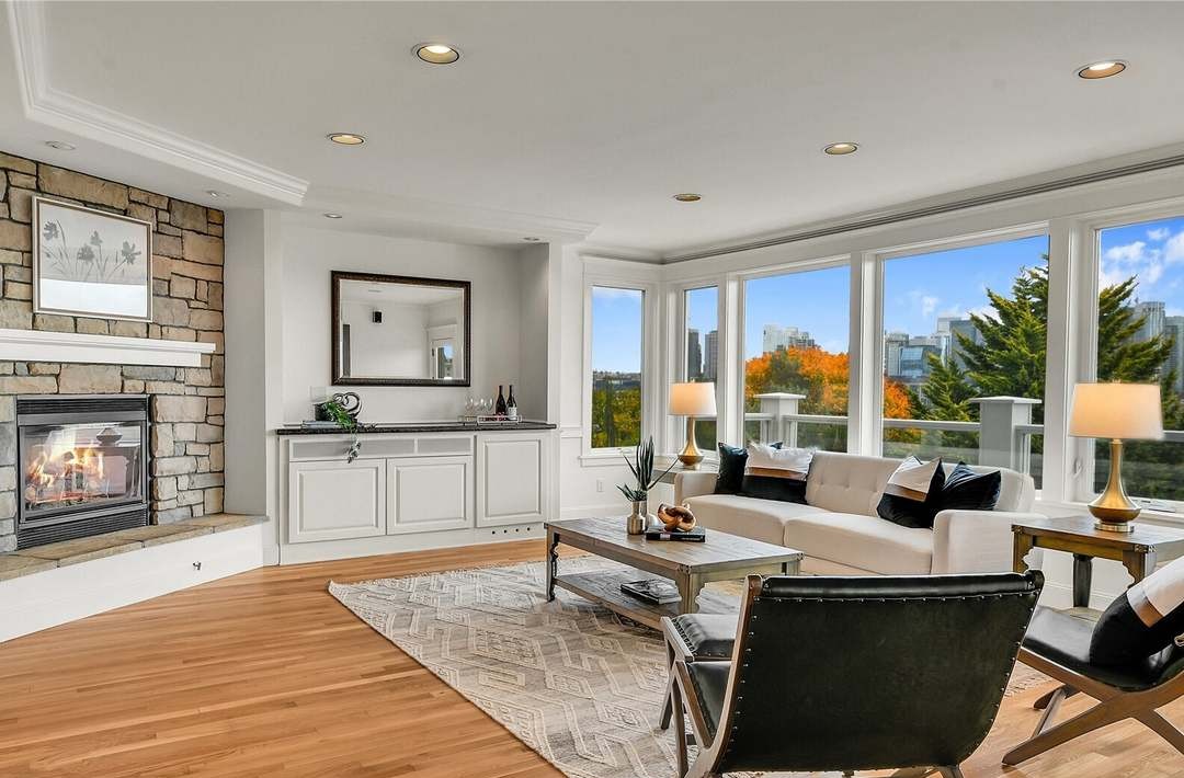 A stunning upper-floor living room that exemplifies transitional luxury design with soaring floor-to-ceiling windows framing autumn foliage and city views, anchored by a traditional brick fireplace with modern white cabinetry and quartz countertop. The coffered ceiling, warm hardwood floors, neutral palette, and carefully curated contemporary furnishings create a serene yet sophisticated retreat that balances architectural detail with modern minimalism.