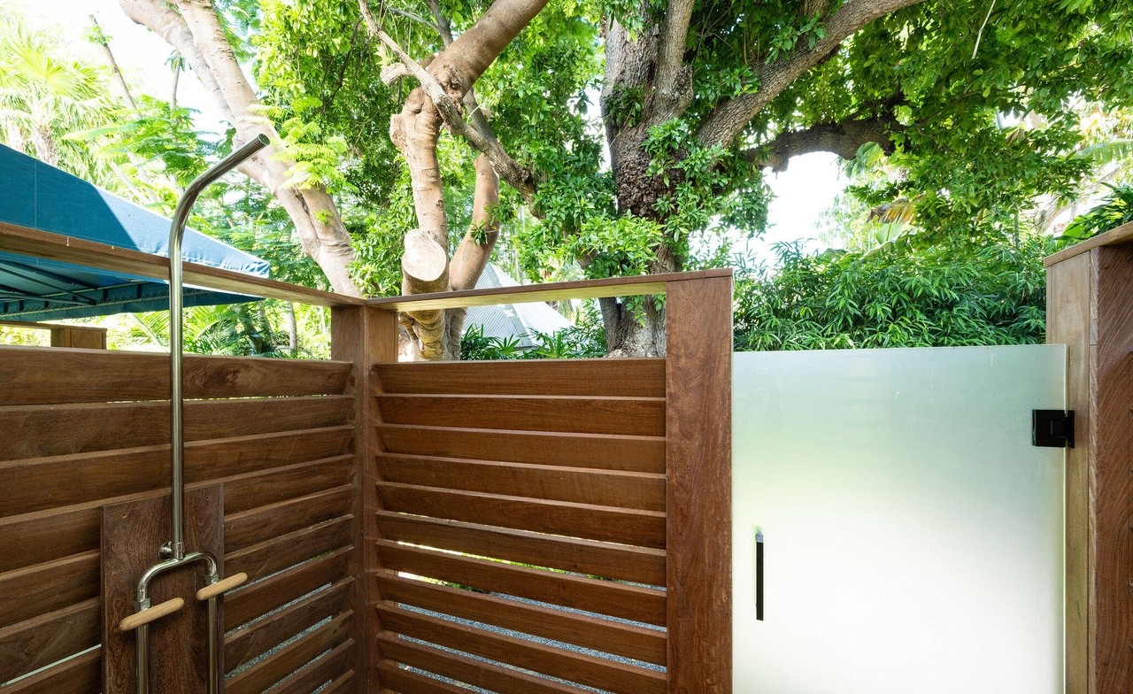 A sophisticated outdoor shower sanctuary nestled beneath mature trees, featuring custom dark walnut horizontal slat screening and walls that create an intimate, spa-like retreat. The integration of natural landscape elements with modern minimalist design and black metal fixtures creates a luxurious tropical-modern aesthetic with abundant natural light and privacy.