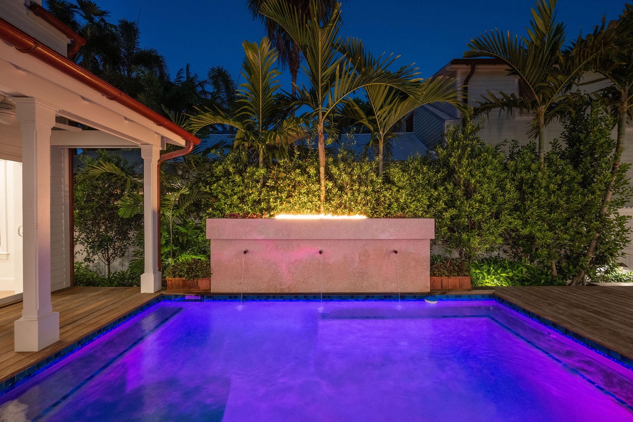 A striking contemporary pool sanctuary featuring jewel-toned LED lighting (electric blue and purple) that transforms the space into a dramatic nighttime retreat. The design seamlessly integrates lush tropical landscaping, a sculptural pink plaster spa feature, hardwood decking, and sophisticated outdoor architecture beneath a clear twilight sky.