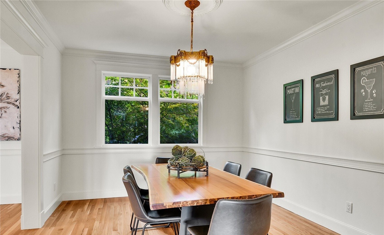 An elegant transitional dining room featuring a striking natural wood table, brass statement chandelier, and wainscoted walls framed by substantial crown molding that anchors the space with classic New England sophistication. Floor-to-ceiling windows flood the room with natural light while three chalkboard beverage menu prints add a refined, subtle accent to the refined palette.