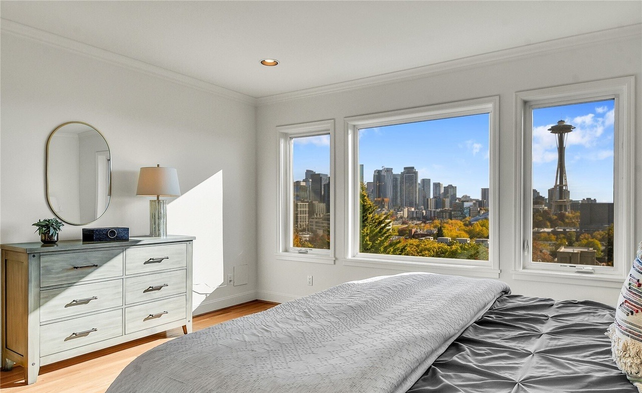 A sophisticated primary bedroom featuring expansive floor-to-ceiling windows framing Seattle's iconic skyline and Space Needle, flooded with natural light. The space blends transitional elegance with organic modern warmth, combining a light wood dresser with brass accents, crisp white walls, soft gray bedding, and refined architectural details like crown molding.