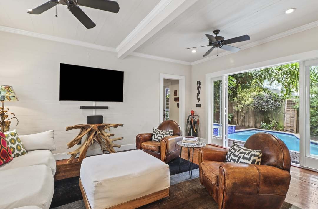 A sophisticated poolside family room featuring transitional design with organic modern warmth, anchored by cognac leather club chairs and a striking driftwood sculptural accent piece beneath a wall-mounted flat-screen. Floor-to-ceiling glass doors flood the space with natural light and views of the backyard pool, while coffered ceilings and carefully curated furnishings with patterned accent pillows create an elevated yet comfortable retreat.